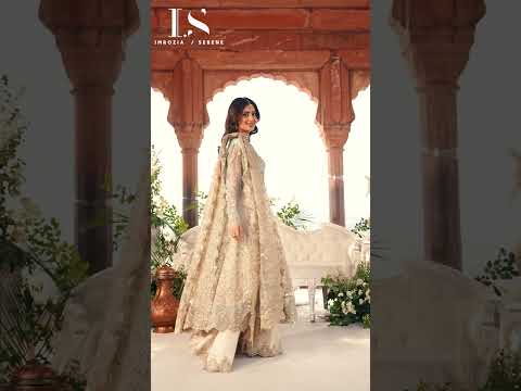 This design showcases embroidered khaddi net with handmade embellishments on the front yoke, paired with matching khaddi net for back yoke and panels. Embroidered organza layers add depth, while sleeves feature khaddi net with organza borders. The dupatta is detailed with lurex appliqué and stone embellishments, finished with dyed raw silk trousers and embroidered borders.