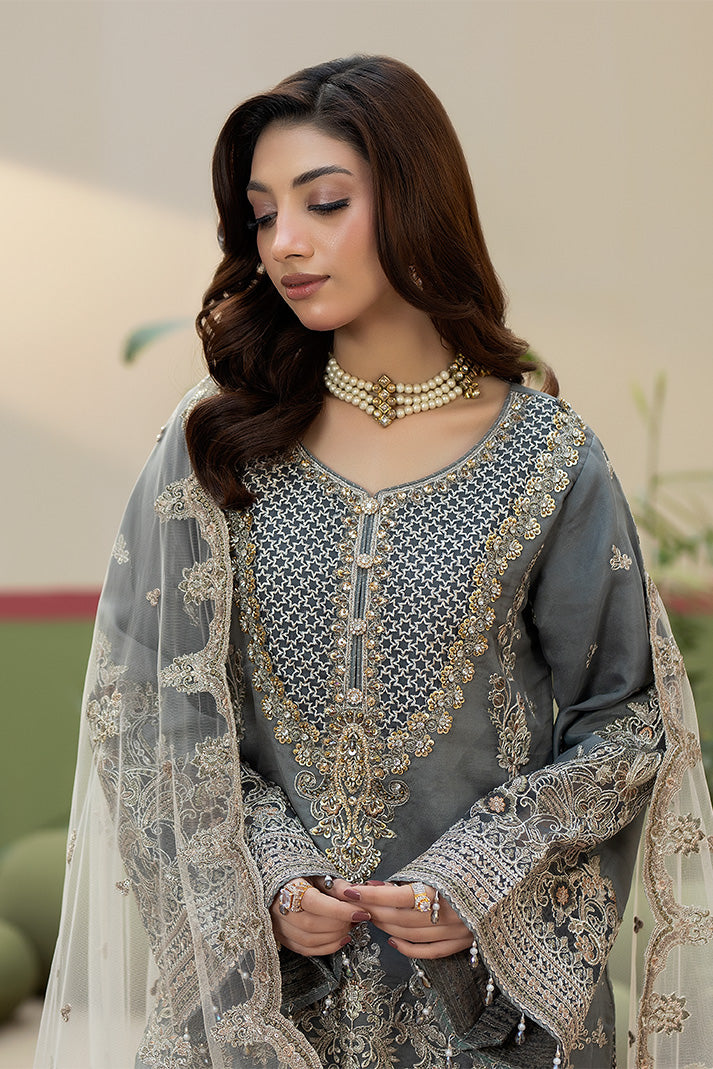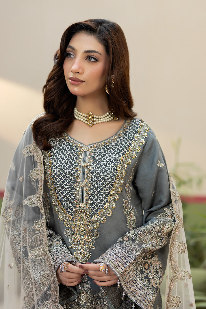 This design features an embroidered organza shirt enriched with subtle handmade embellishments for timeless appeal. It is paired with an embroidered net dupatta that adds airy elegance, along with an embroidered raw silk trouser for a refined finish.