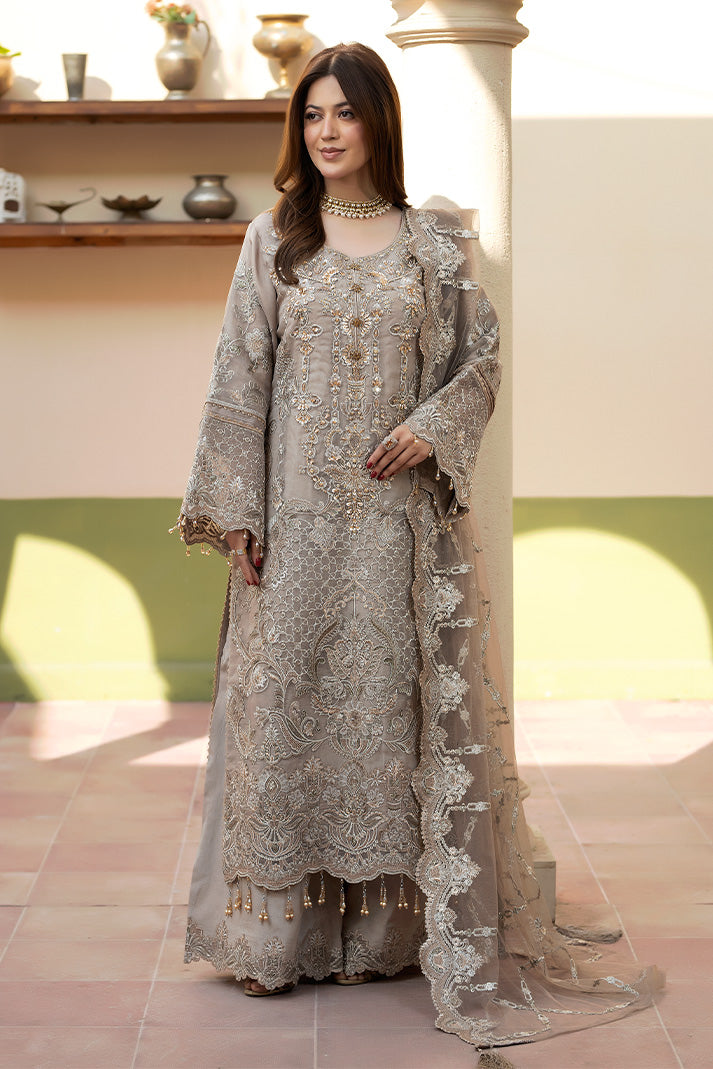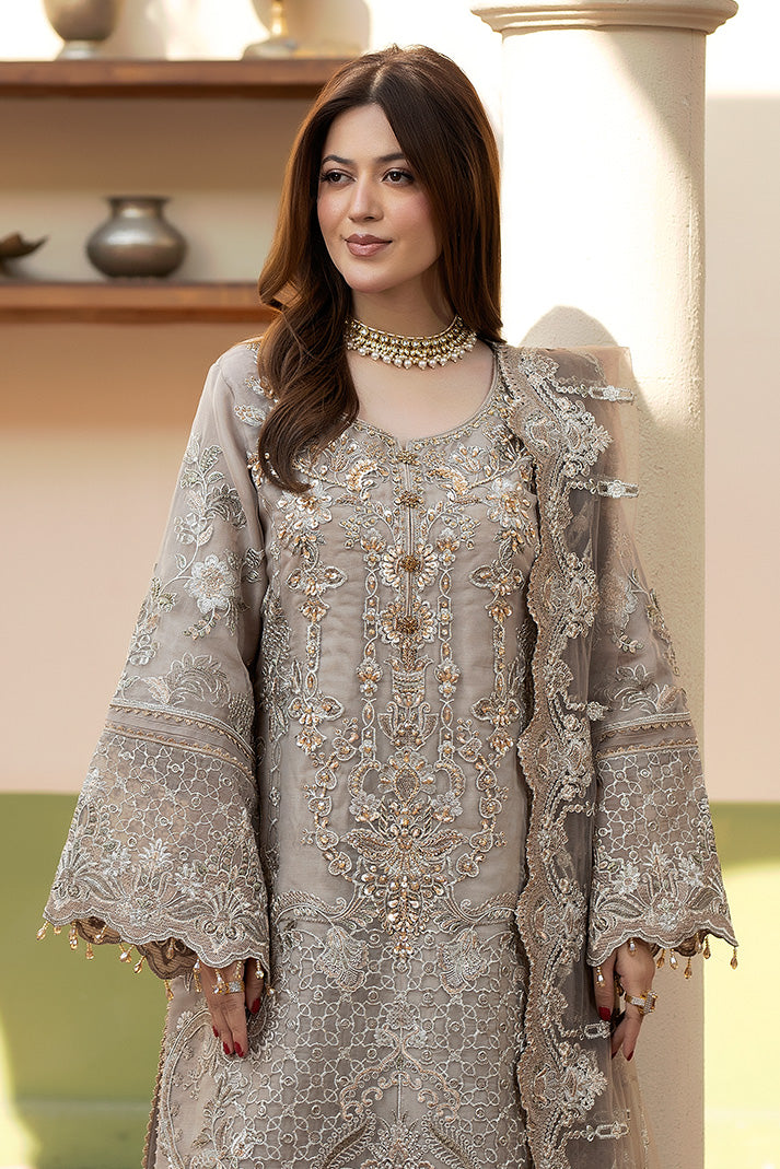 An embroidered organza shirt with graceful handmade embellishments forms the focal point of this ensemble. The embroidered net dupatta adds depth and fluidity, complemented by an embroidered raw silk trouser that completes the look with understated luxury.