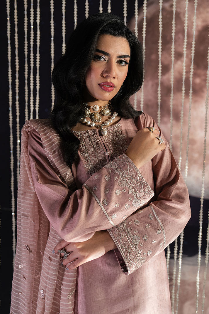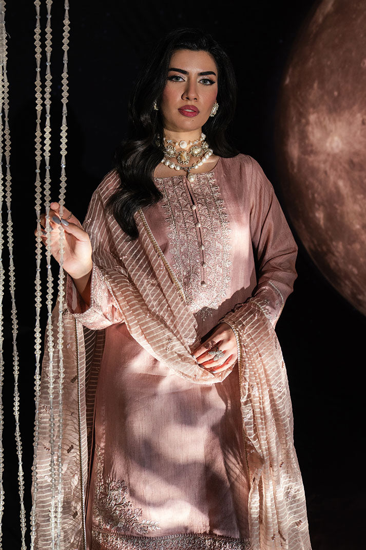 Zaraan embodies modern sophistication in a chic Rose Taupe hue. The embroidered raw silk shirt features intricate detailing that elevates the overall aesthetic, while the airy embroidered organza dupatta adds a soft, ethereal contrast. Finished with a coordinated embroidered raw silk trouser, this ensemble is perfect for those who appreciate subtle glamour with contemporary appeal.