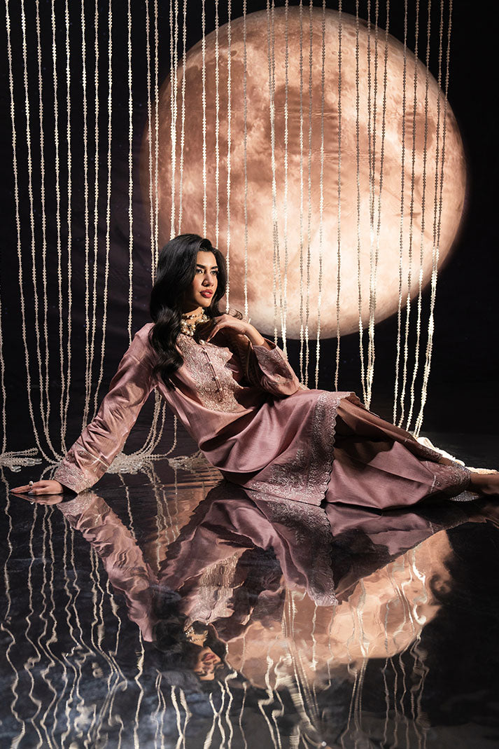Zaraan is a modern Rose Taupe luxury pret dress designed for effortless sophistication. The embroidered raw silk shirt features fine detailing on the front, neckline, and sleeves, offering a structured yet elegant finish.