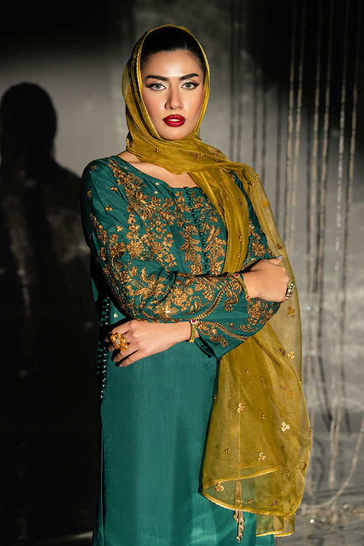 Mehrun is a statement of bold elegance crafted in a striking Deep Teal Green shade. The embroidered raw silk shirt showcases intricate artistry, complemented by a luxurious masoori zari dupatta that adds richness and festive charm. Paired with an embroidered raw silk trouser, this ensemble is designed for formal occasions where timeless luxury takes center stage.
