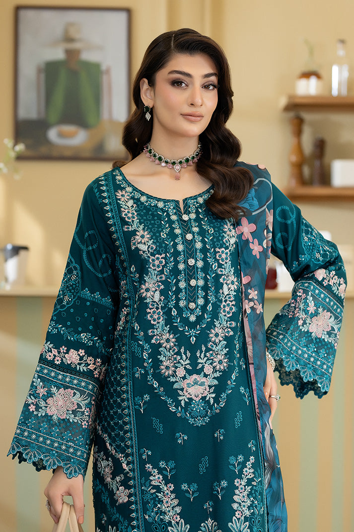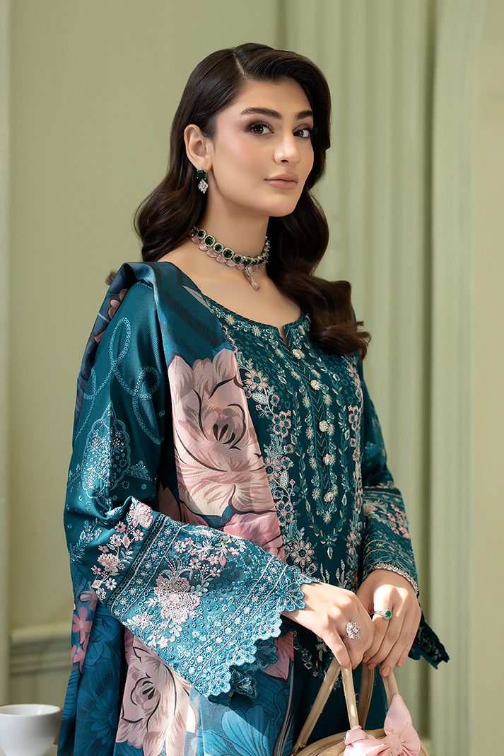 This design features a beautifully embroidered viscose shirt enriched with intricate threadwork across the front and sleeves. The printed silk dupatta brings a vibrant floral contrast with a lightweight, flowing drape. Paired with an embroidered viscose trouser finished with detailed hem borders, the outfit offers a seamless blend of elegance and structure.