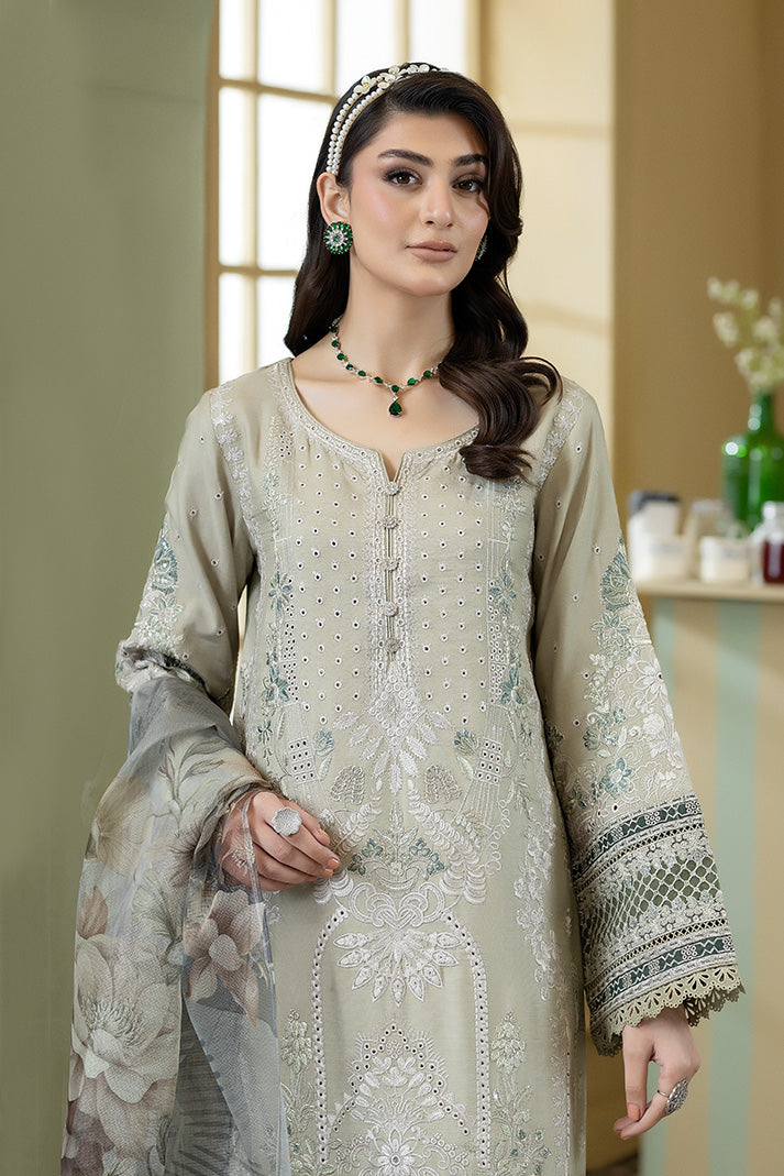 This ensemble includes an embroidered viscose shirt featuring intricate craftsmanship along the neckline, sleeves, and hem. It is paired with a printed khadi net dupatta that adds airy texture and delicate floral artistry. The embroidered viscose trouser, detailed with refined border work, ensures a polished and elegant finish.