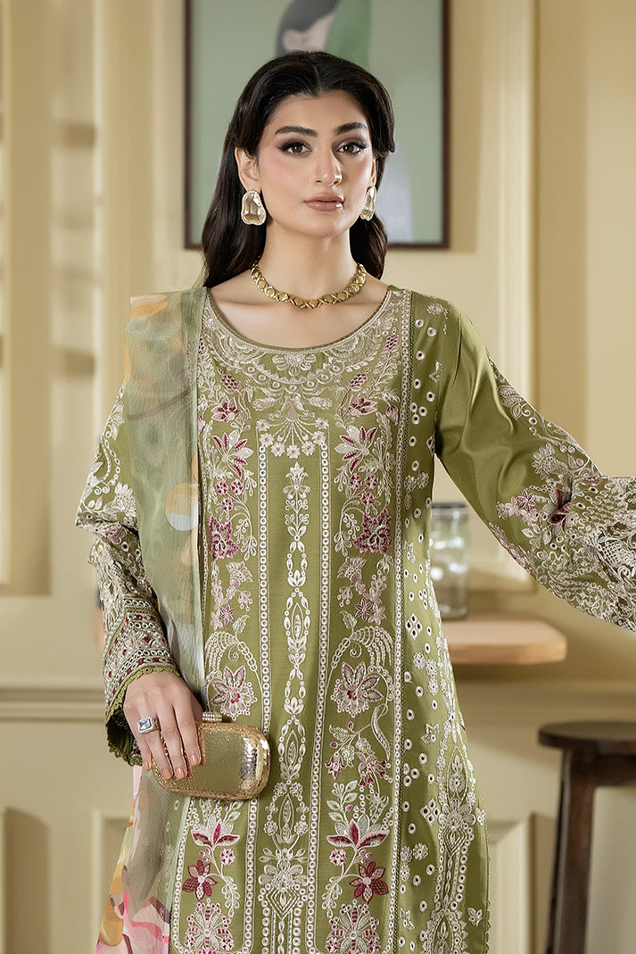 This design showcases an embroidered viscose shirt enriched with vertical patterns and ornate border detailing. The printed khadi net dupatta enhances the outfit with soft floral prints and graceful movement. Paired with an embroidered viscose trouser finished with intricate hem accents, the ensemble reflects timeless elegance.