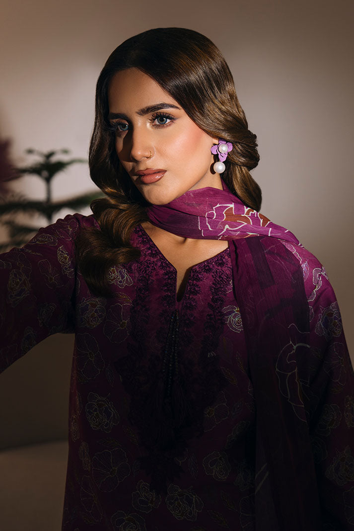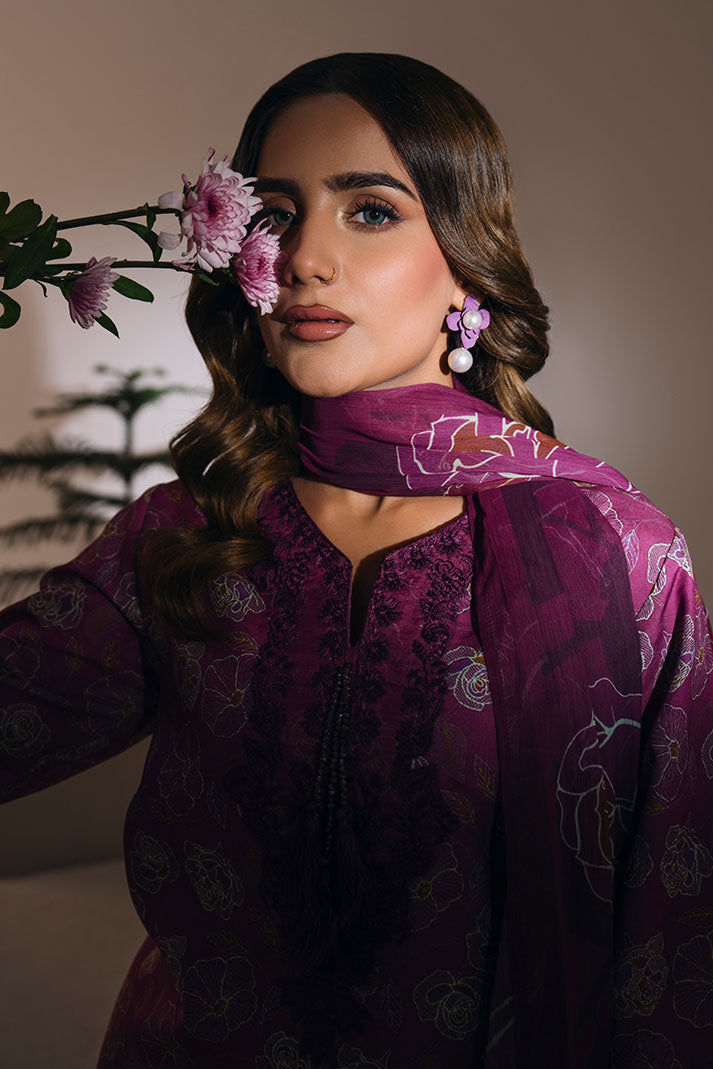 Designed with a printed lawn shirt featuring fine embroidered accents, this outfit offers refined summer styling. The printed chiffon dupatta adds lightness, complemented by a printed lawn trouser.