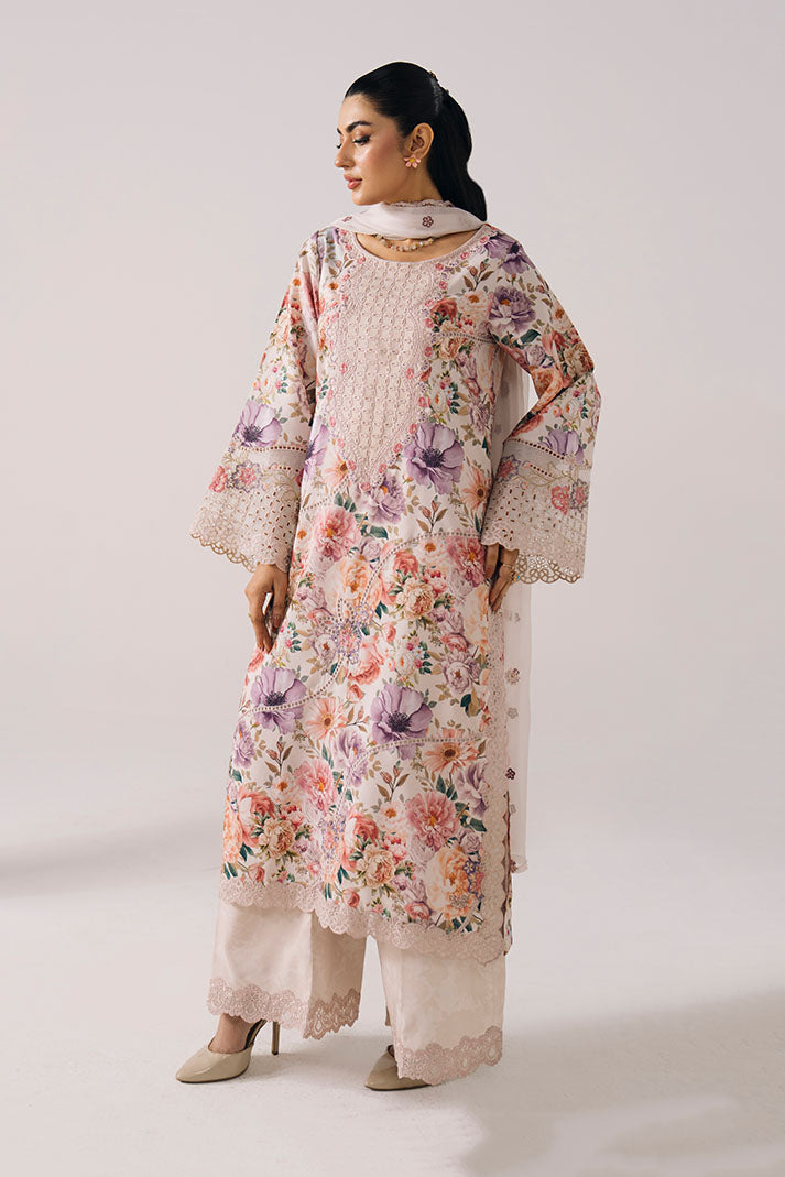 This design features a beautifully printed lawn shirt enhanced with delicate embroidery on the neckline and sleeves, offering a refined yet breathable summer look. It is paired with an embroidered chiffon dupatta that adds graceful movement and elegance. The printed lawn trouser completes the outfit with effortless comfort, making it ideal for warm-weather styling.