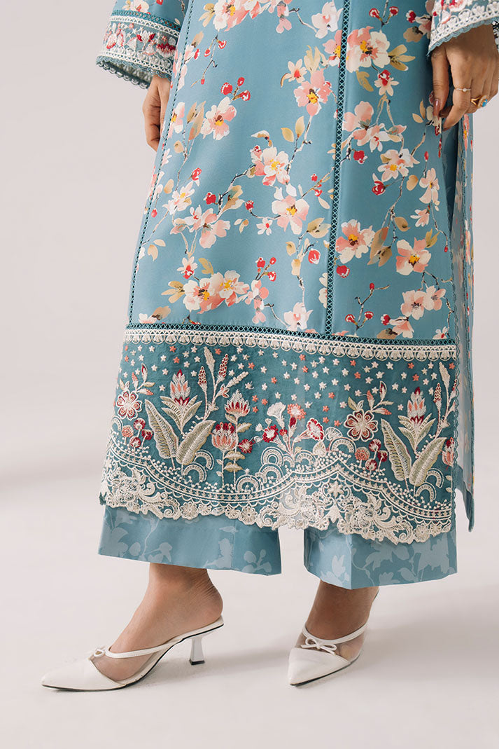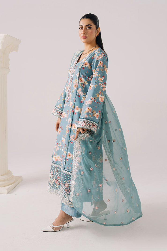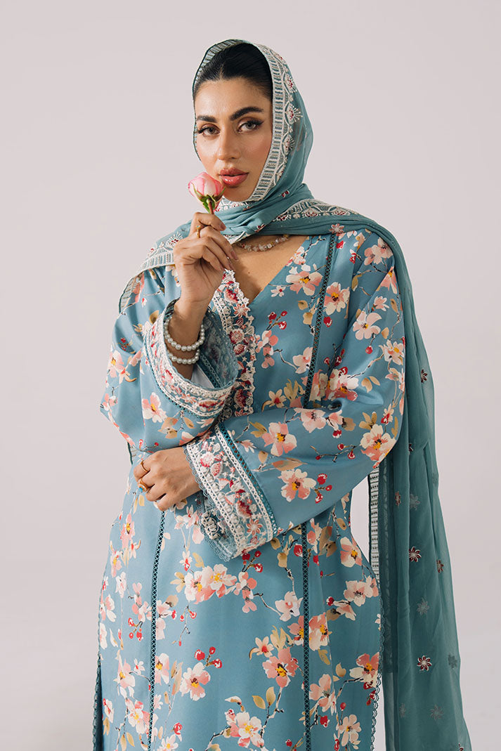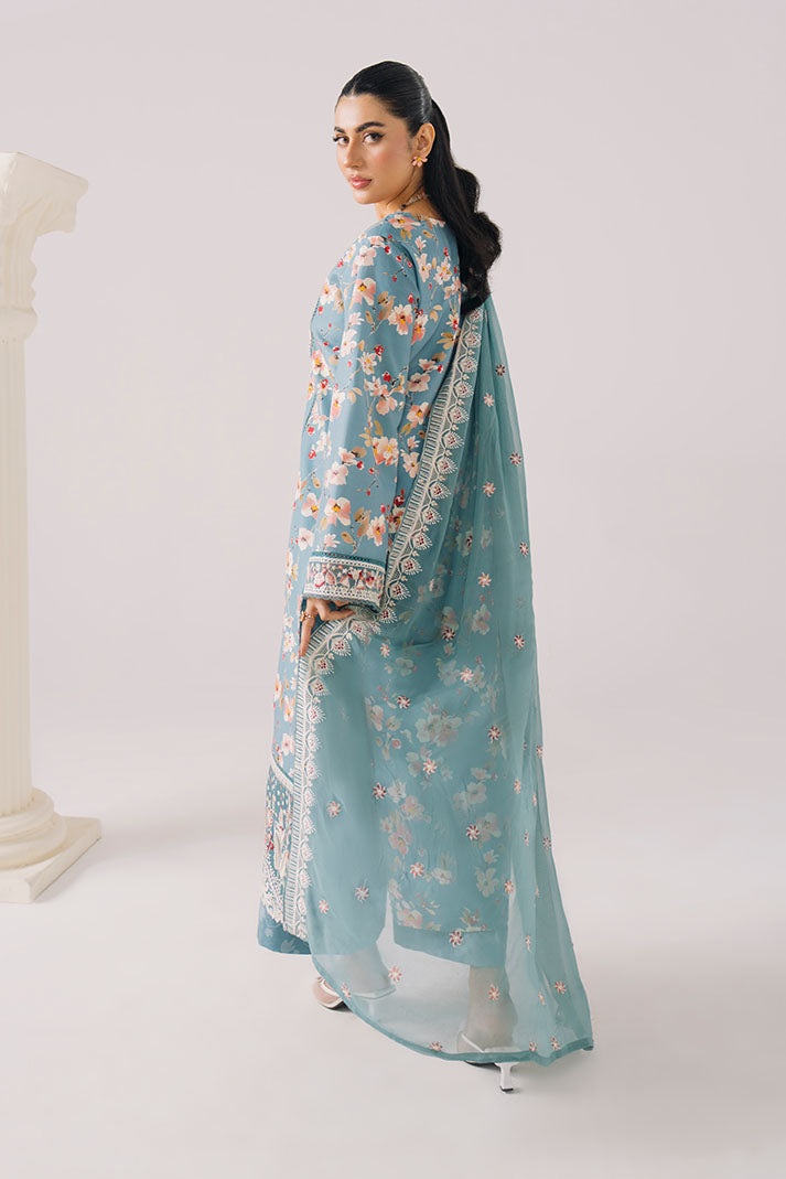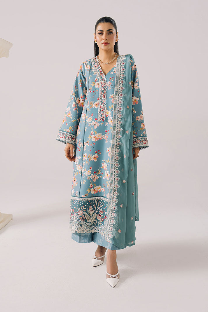 This outfit showcases a printed lawn shirt accented with subtle embroidery for a sophisticated summer aesthetic. Complemented by an embroidered chiffon dupatta, it offers lightness and fluidity. The printed lawn trouser adds ease and practicality, perfect for daytime wear.