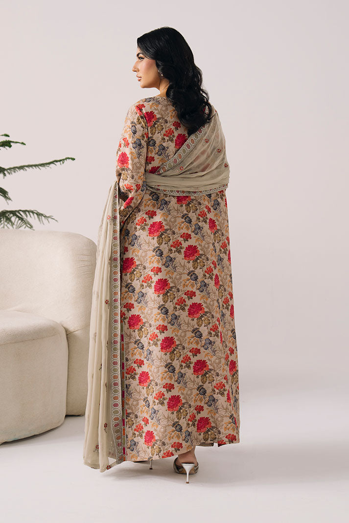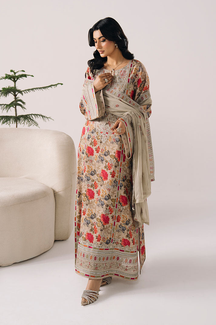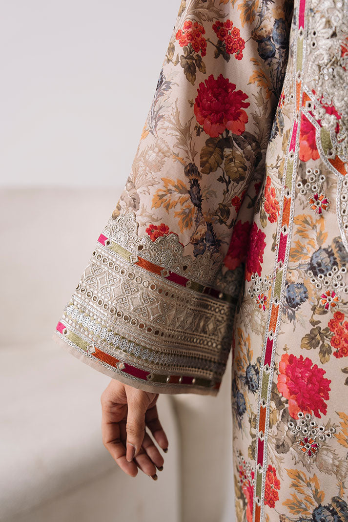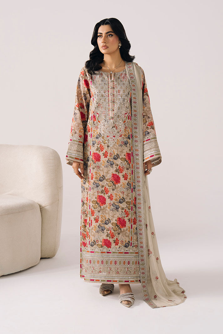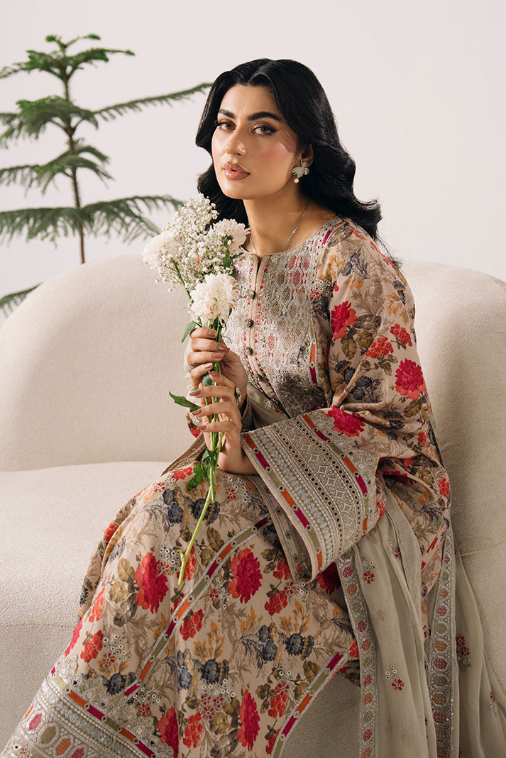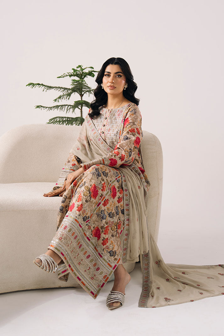 The printed lawn shirt is elevated with delicate embroidery, creating a soft and refreshing summer aesthetic. An embroidered chiffon dupatta adds flow, while the printed lawn trouser ensures comfort.