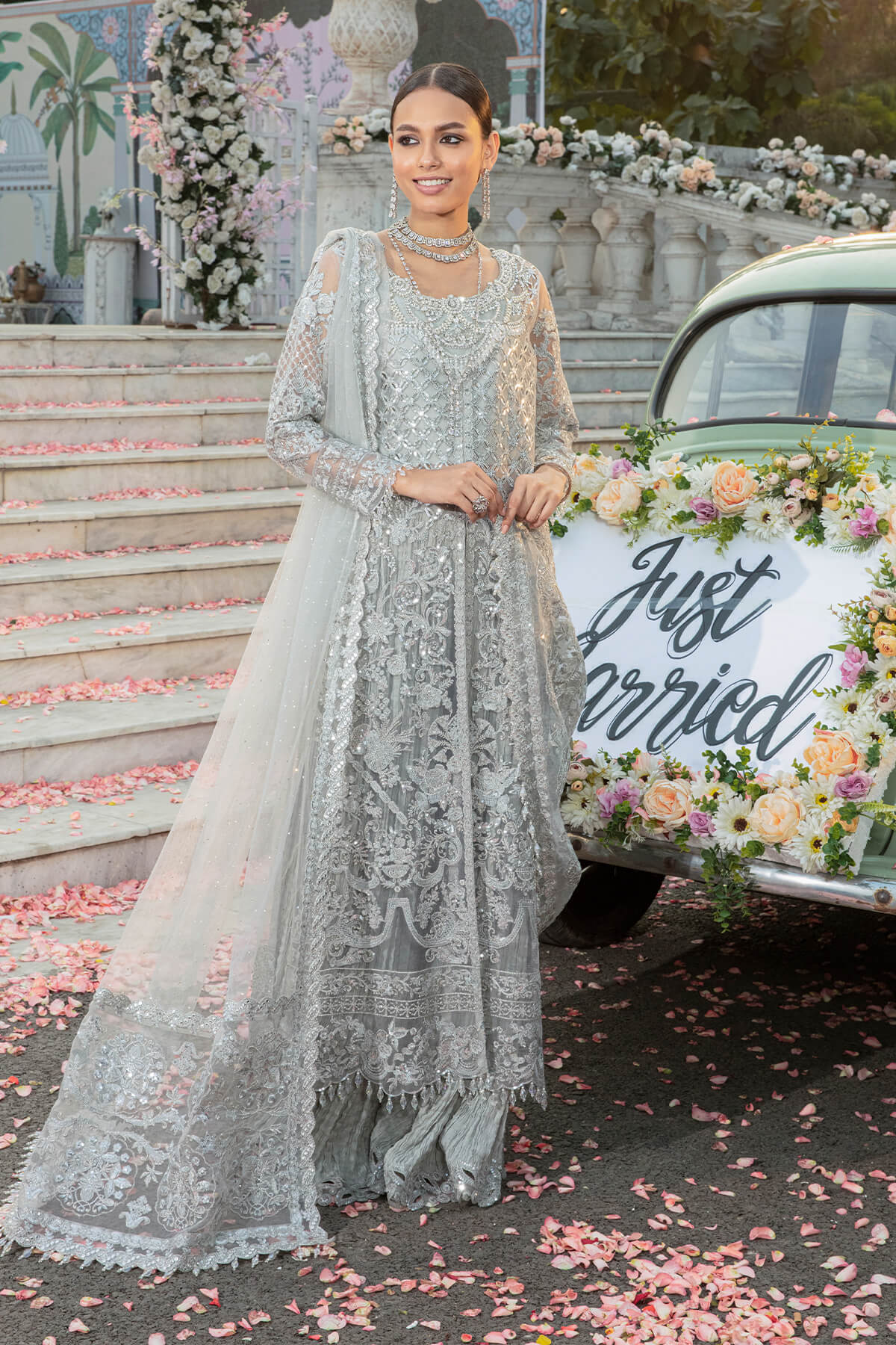 Embroidered & hand embellished net front open right left panels