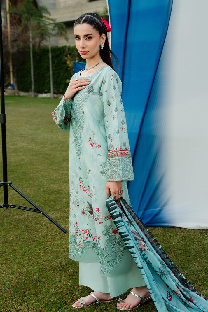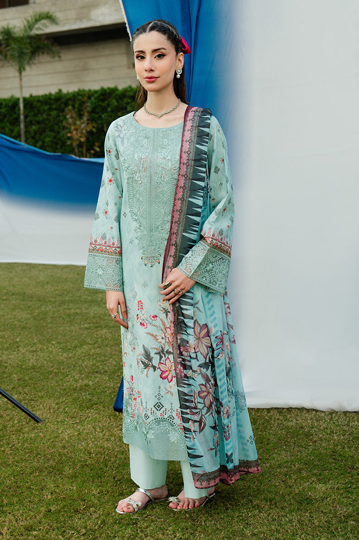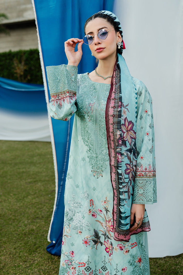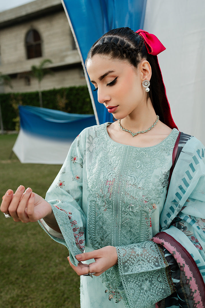 Aqua Serene is a refreshing aqua mint ensemble delicately adorned with intricate embroidery and soft floral accents that embody refined summer elegance. The shirt features an embroidered organza neckline and statement front motif layered over an embroidered and printed lawn base, creating depth and texture. Coordinated printed sleeves and back maintain harmony, while the silk dupatta introduces fluidity with its artistic floral composition. Finished with an embroidered cotton trouser, this unstitched lawn design captures sophistication, freshness, and timeless seasonal charm.