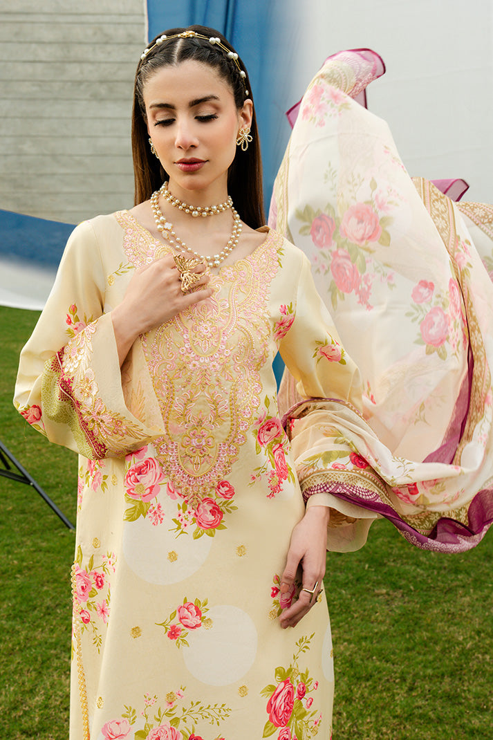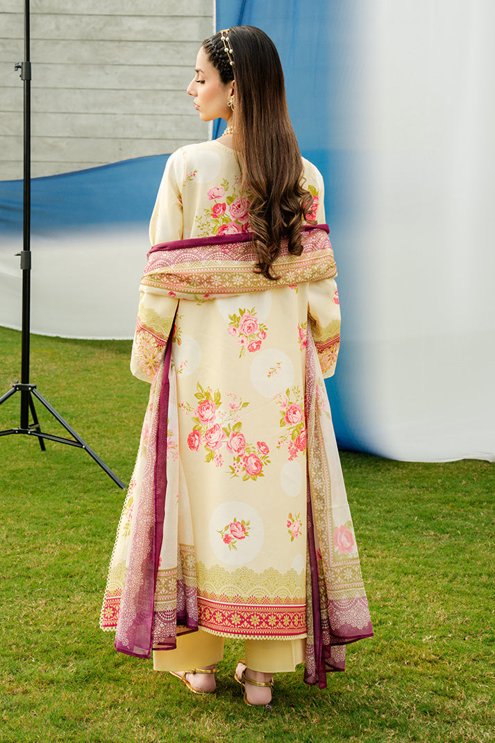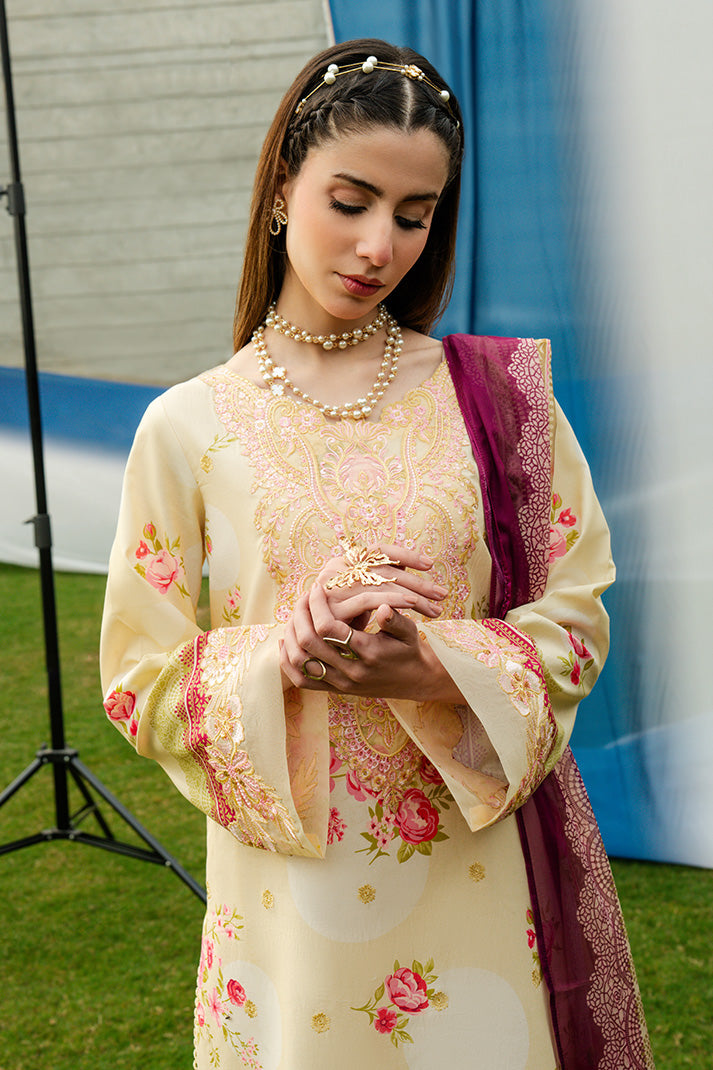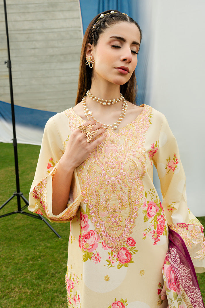 Buttercream Rose is a graceful summer ensemble crafted on a soft buttercream yellow lawn base adorned with blooming rose pink florals and intricate embroidery. The embroidered organza neckline and detailed front border elevate the embroidered and printed lawn canvas, adding depth and refined elegance. Complemented by a rich maroon printed silk dupatta that creates a striking yet harmonious contrast and finished with an embroidered cotton trouser, this unstitched lawn design embodies timeless femininity and sophisticated seasonal charm.