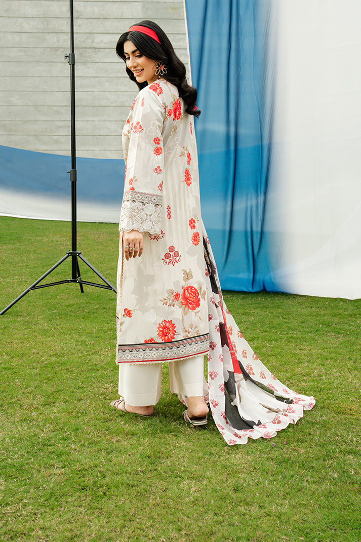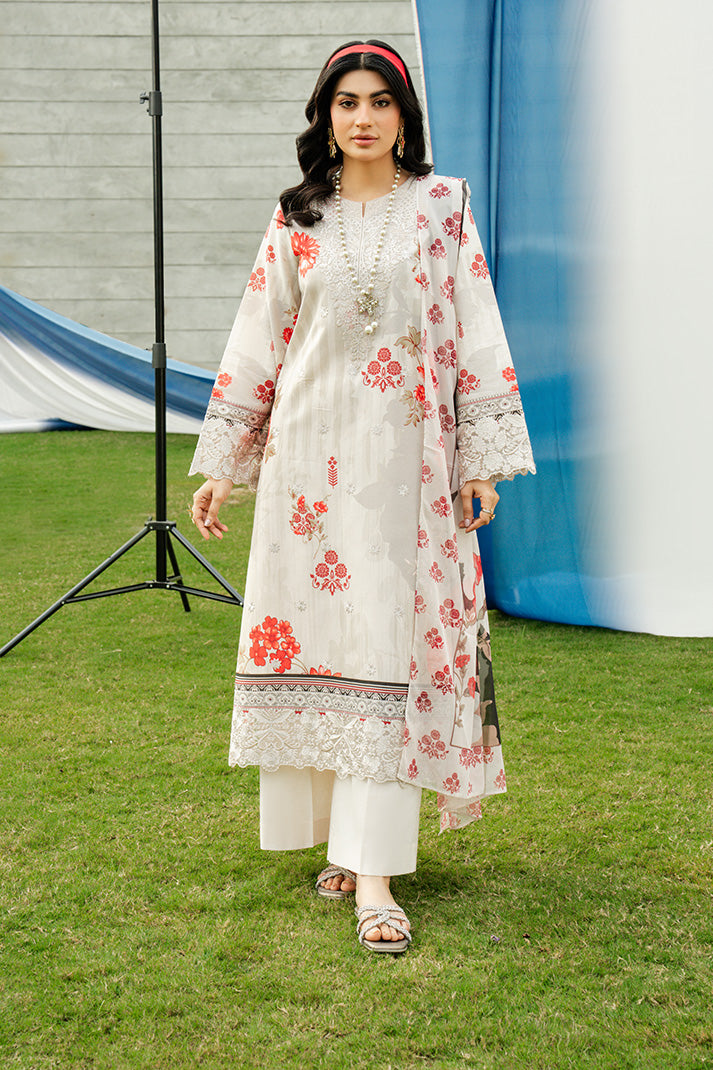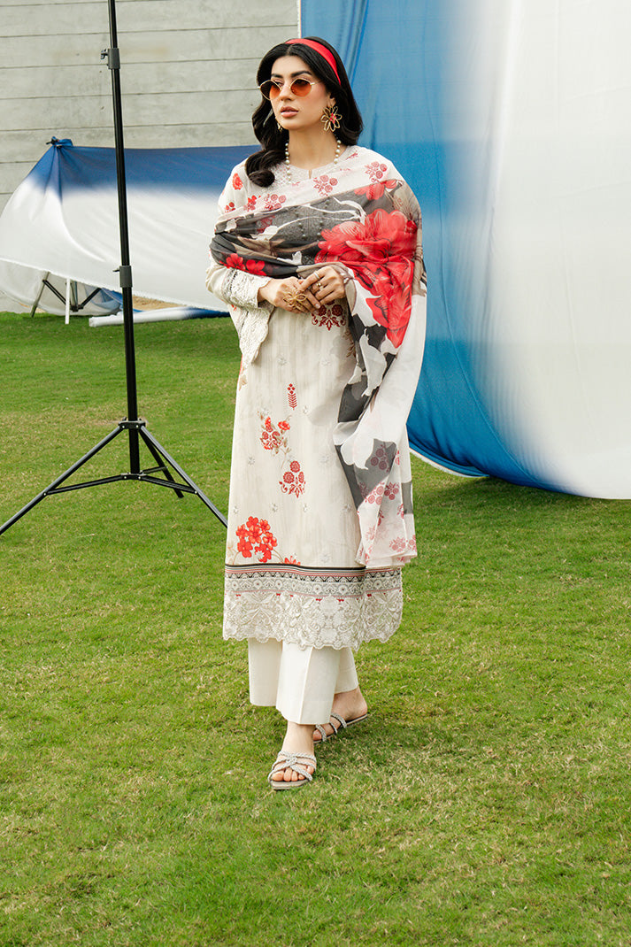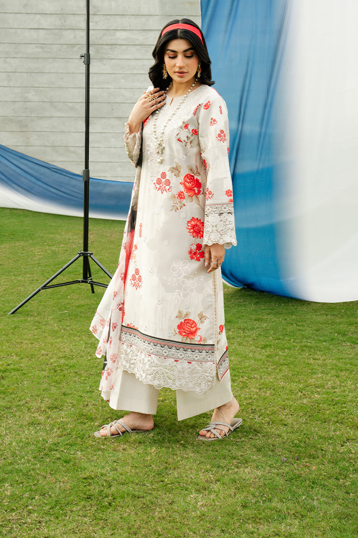 Pearl Blossom is a refined summer ensemble crafted on a soft pearl ivory lawn base adorned with striking scarlet floral motifs that create a graceful yet eye-catching contrast. The embroidered organza neckline enhances the delicately embroidered and printed lawn front, while intricately detailed sleeve borders add a polished finish. Complemented by a fluid printed silk dupatta and completed with an embroidered cotton trouser, this design embodies timeless elegance and understated sophistication, perfect for both elevated daytime wear and festive occasions.