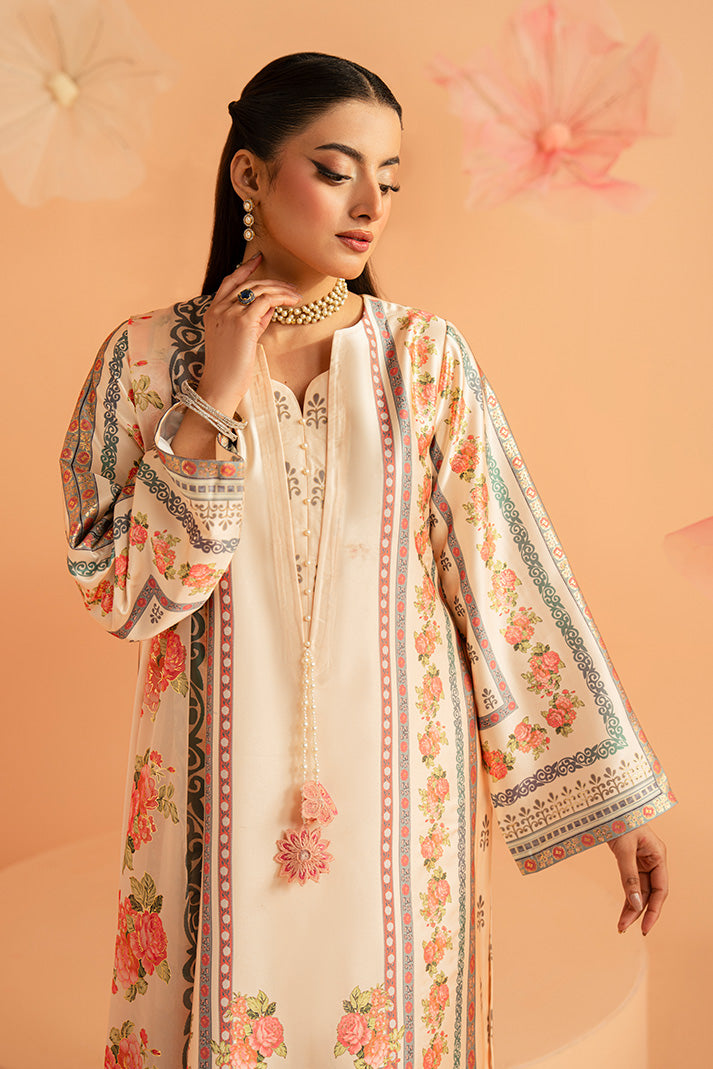 Rosé Charm is made from high-quality printed silk, offering a smooth texture with a subtle sheen. The digitally printed silk shirt is paired with a matching silk trouser for effortless coordination. The lightweight printed chiffon dupatta adds a delicate and flowing finish, making it an elegant statement ensemble.
